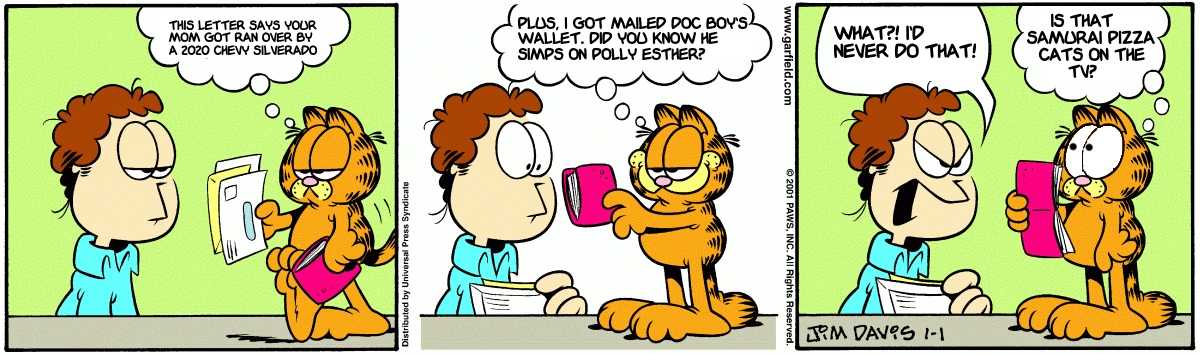 Garfield {holding up mail}: This letter says your mom got ran over by a 2020 Chevy Silverado