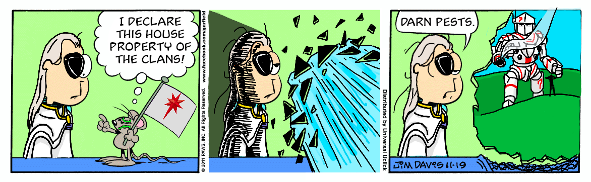 and so in 3049 the Clans invaded the Inner Sphere and were only stopped by Precentor Martial Anastasius Focht of ComStar abusing their honor code on Tukayyid in 3052 by using their absurd bidding process to get them into a real battle as fought by people who'd been spending the last quarter of a millennium practicing total war to kick each other's teeth in. Jon here plays the role of Focht, who is, in the fandom, a memetic badass... which makes for a nice change of pace for Garfield's owner. The mouse is some random Clan Star Colonel, doesn't matter who, and the 75-ton BattleMech is a 75-ton BattleMech. If you must have a Garfield, assume he's a Mechwarrior piloting the 'Mech.